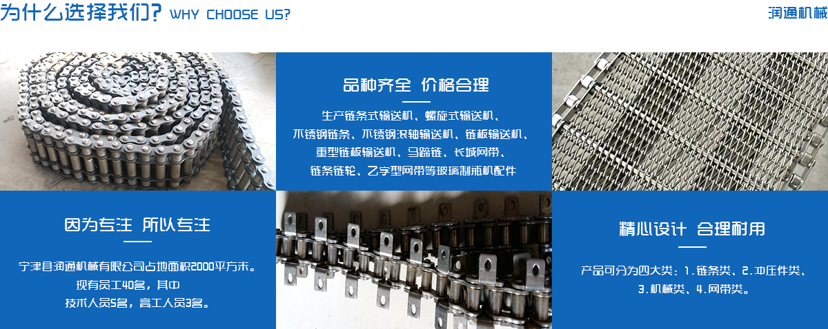 生產鏈條式輸送機、螺旋式輸送機、不銹鋼鏈條、不銹鋼滾軸輸送機、鏈板輸送機、重型鏈板輸送機、馬蹄鏈、長城網(wǎng)帶、鏈條鏈輪、乙字型網(wǎng)帶等玻璃制瓶機配件,食品機械配件及各種網(wǎng)帶的專業(yè)廠家 ,多年來產品暢銷各地玻璃廠和食品廠,在玻璃制品等行業(yè)中享有較高的聲譽。公司集摸具開發(fā)、機械設計生產,銷售于一體的生產型企業(yè)。生產的自動化流水線金屬傳動網(wǎng)帶、鏈條等產品廣泛用于玻璃機械、食品機械、化纖機械、醫(yī)藥、電子、烘干機械、輪胎機械等行業(yè)。產品多銷往各個城市的機械廠、食品廠和一些涉及流水線或自動化設備的公司。